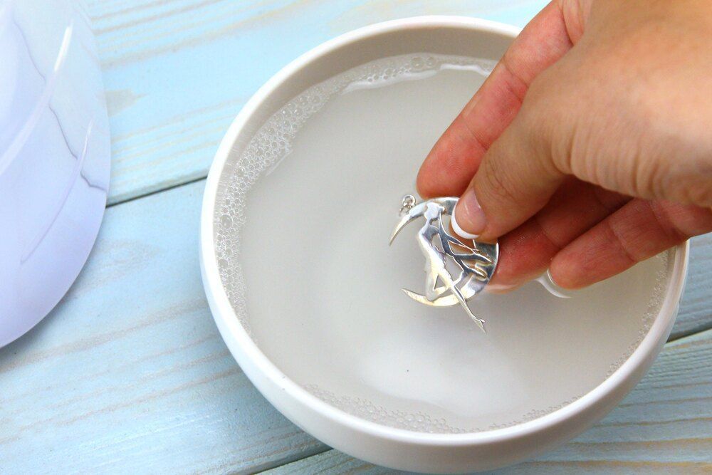 Нашатырный спирт используют в чистом виде или на его основе делают раствор — на стакан воды берут 6–7 капель средства. В чистом виде спирт используют так: смачивают в нем мягкую тряпочку, украшение протирают этой тряпочкой, а потом промывают в мыльном растворе и чистой воде. Раствор нашатырного спирта используют так: украшение опускают в жидкость на 30 минут, потом достают и протирают щеточкой или ватной палочкой, опускают в раствор еще раз и после протирают насухо бумажным полотенцем.